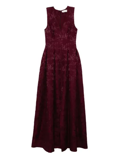 dark red concealed rear hook and zip fastening all-over floral embroidery front slit V-neck