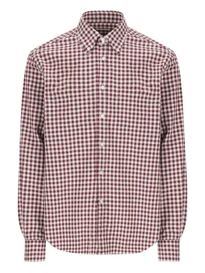 burgundy checked pattern button fastening chest pocket buttoned cuffs classic collar