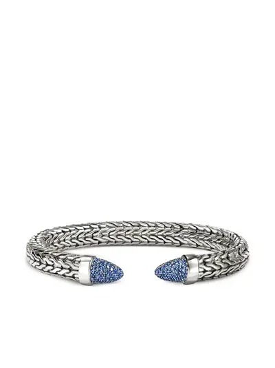 sterling silver woven design sapphire embellishment round cut open cuff Normal everyday use and external agents may reduce the lustre of gemstones and gold surfaces. To maintain, use specific, non-abrasive products specially meant for cleaning jewellery.