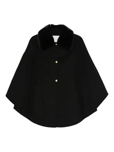 black faux-fur collar front button fastening side slit pockets cape design round neck