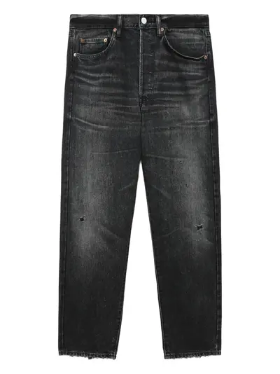 black denim classic five pockets belt loops button and fly fastening distressed effect