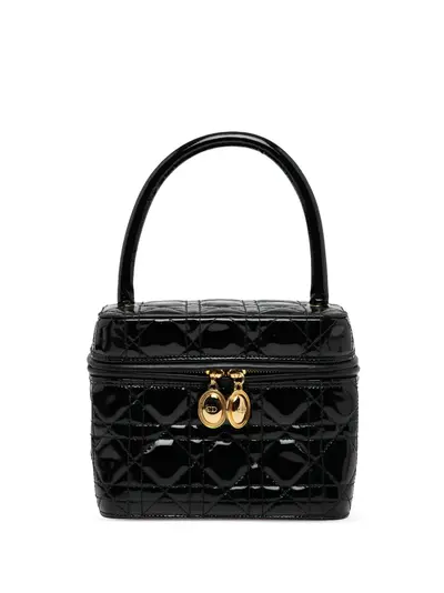 quilted patent leather body flat top handle top zip around closure interior slip closure black Inclusions: dust bag, mirror. Condition: GOOD. This previously owned and used item is in good condition with minimal signs of use. This may include fading of material or plating and scratches. Due to the exclusivity of this item and its limited availability, processing and delivery might take longer than usual. Please refer to the photos on this product page for a detailed view of the item, including any damages declared.