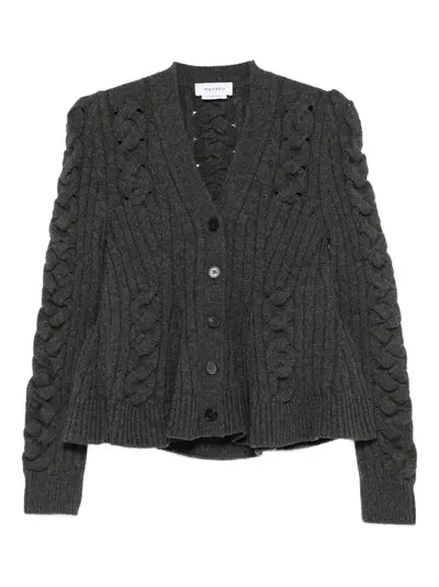 dark grey cable knit front button fastening V-neck long sleeves peplum hem