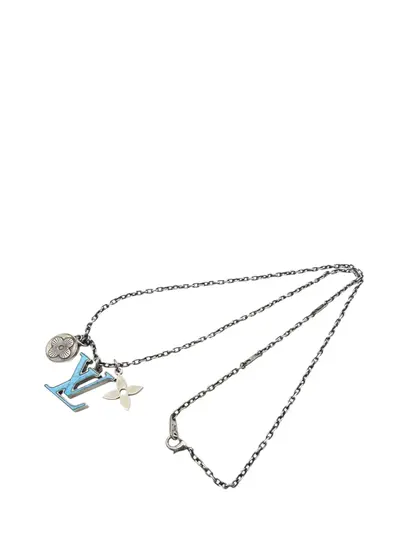 silver plated chain and charms logo pendant with resin detail lobster clasp closure blue Inclusions: dust bag, box. Condition: GOOD. This previously owned and used item is in good condition with minimal signs of use. This may include fading of material or plating and scratches. Due to the exclusivity of this item and its limited availability, processing and delivery might take longer than usual. Please refer to the photos on this product page for a detailed view of the item, including any damages declared.