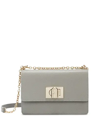 grey leather pebbled texture foldover top with twist-lock fastening leather and chain-link shoulder strap rear patch pocket gold-tone hardware main compartment internal patch pocket full lining