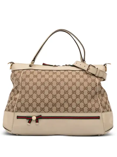canvas body with leather trim flat leather handles detachable flat leather strap top zip closure interior zip and slip pockets brown Serial Number: 257349 525040 Inclusions: shoulder strap. Condition: GOOD. This previously owned and used item is in good condition with minimal signs of use. This may include fading of material or plating and scratches. Declared Damages: Front Feature(s) Minor Loose Stitching. Please refer to the photos on this product page for a detailed view of the item, including any damages declared.