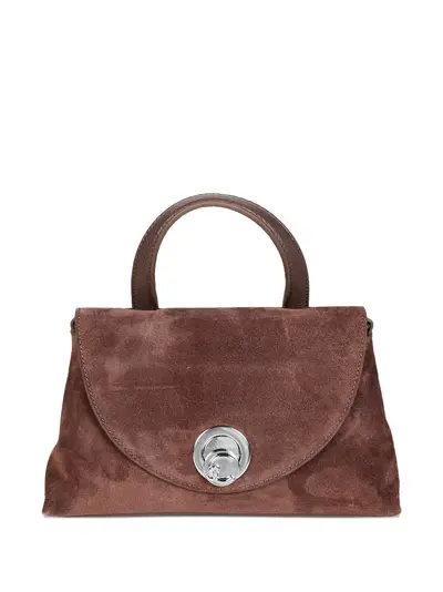 brown top handle silver-tone hardware suede finish grained texture panel turn-lock fastening This item comes with a standard two-year warranty from the brand.