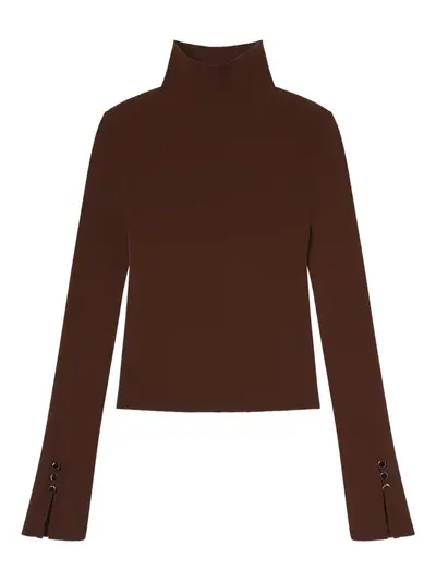 brown ribbed knit high neck long sleeves buttoned cuffs cuff slits
