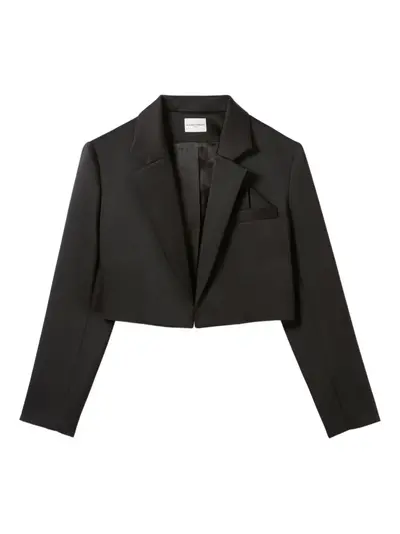 black cropped cut notched lapel chest welt pocket structured shoulders straight hemline