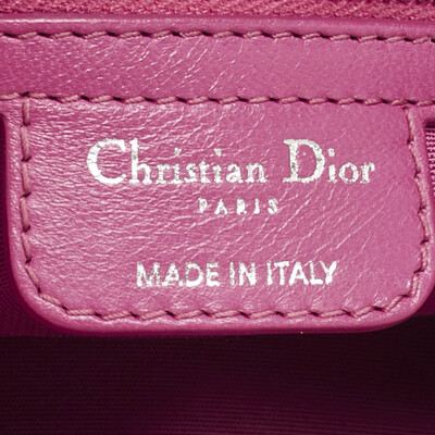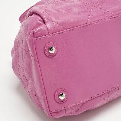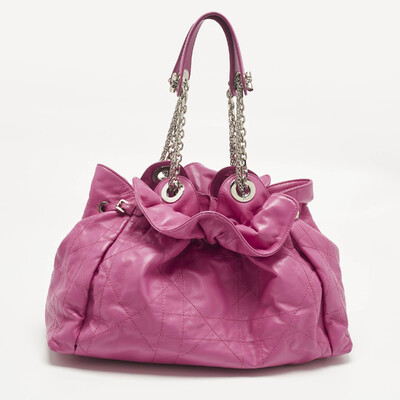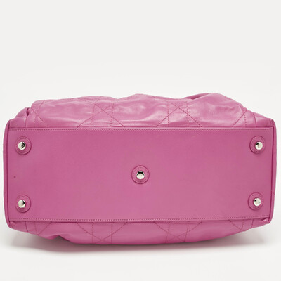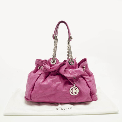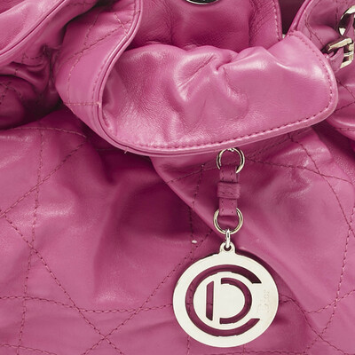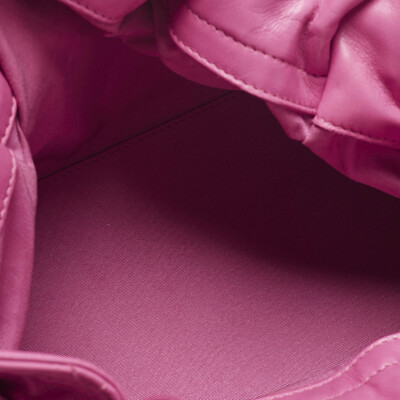 The Dior Le Trente bag is crafted from soft pink leather with the house’s Cannage stitching faintly traced across its surface. The gathered top creates a fluid, almost sculpted shape that rests easily on the shoulder. Silver tone chain handles thread through metal eyelets, adding a contrast to the playful color.
