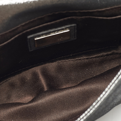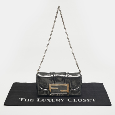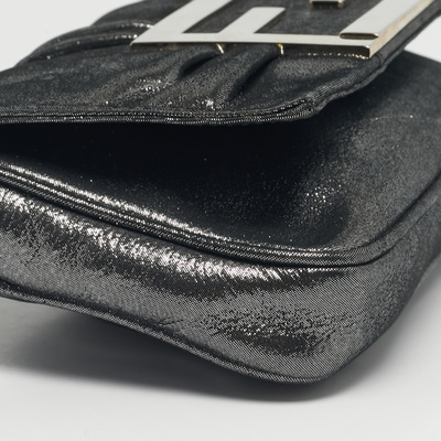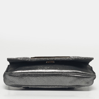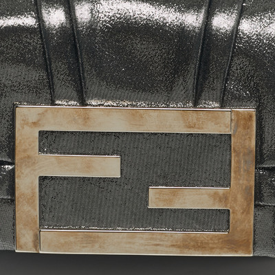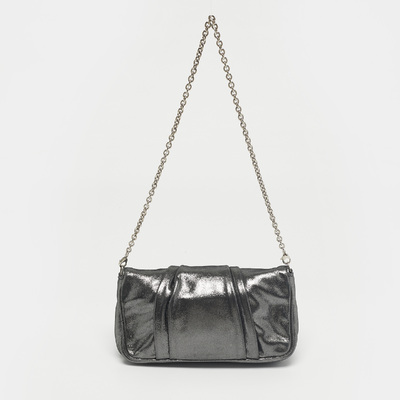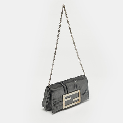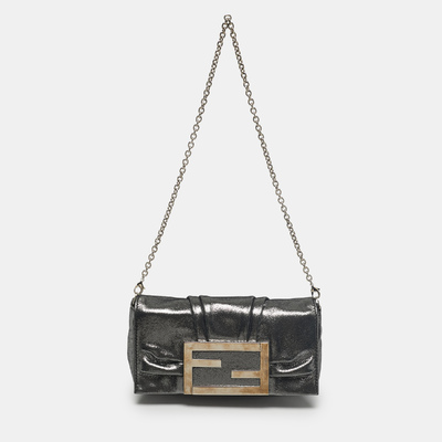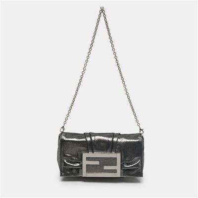 Add a touch of glamour to your look with this Fendi Mia Pochette, crafted from metallic grey shimmer leather. Its compact silhouette and subtle logo detailing embody effortless luxury. Perfect for evening events or pairing with minimal daywear for a refined sparkle.