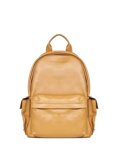 caramel brown leather top handle adjustable shoulder straps front zip pocket side patch pocket