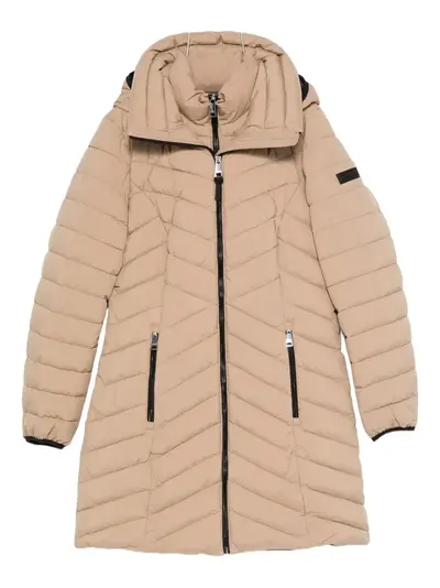 camel brown quilted design detachable hood front zip fastening side zip pockets long sleeves