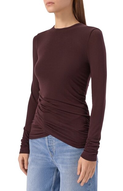 Облегающий лонгслив Eve сшили из стрейчевого трикотажа на основе лиоцелла. Спереди модель с круглой горловиной дополнили перекрестной драпировкой, формирующей асимметричную линию низа.