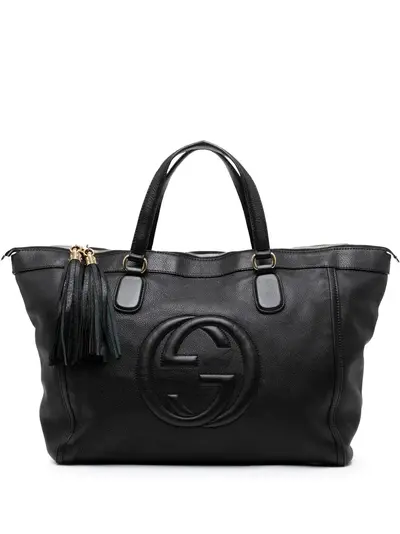 leather body flat leather handles top zip closure with tassel detail interior zip and slip pockets black Serial Number: 282306 213317 This item has no inclusions. Condition: GOOD. This previously owned and used item is in good condition with minimal signs of use. This may include fading of material or plating and scratches. Please refer to the photos on this product page for a detailed view of the item, including any damages declared.
