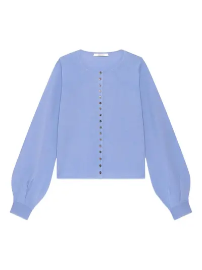 light blue round neck front button fastening balloon sleeves ribbed cuffs ribbed hem