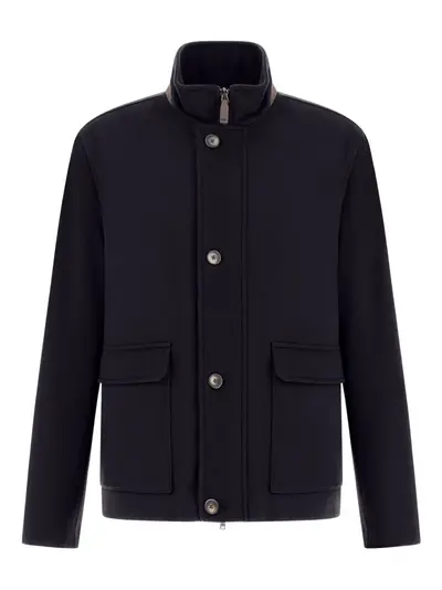 dark blue high neck logo plaque flap pockets contrasting trim zip and button fastening