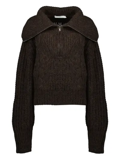 dark brown cable knit high neck front zip fastening long sleeves