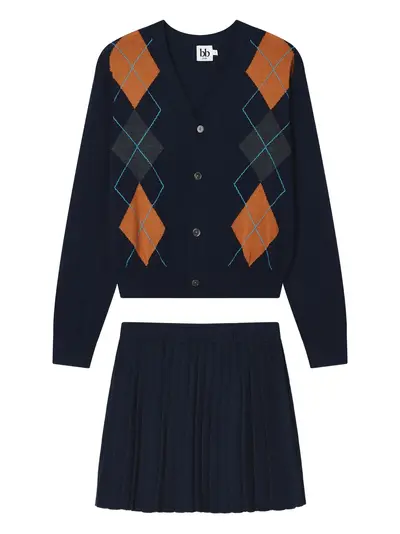 navy blue argyle pattern V-neck button fastening long sleeves pleated skirt