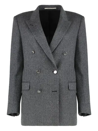 grey double-breasted button fastening flap pockets herringbone pattern buttoned cuffs