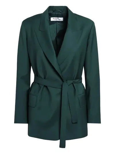green wrap front self-tie belt long sleeves peak lapel flap pockets