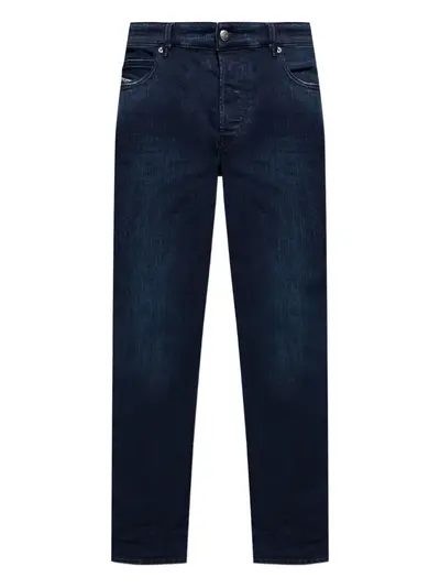 dark blue logo plaque five-pocket styling button fly straight leg mid-rise waist