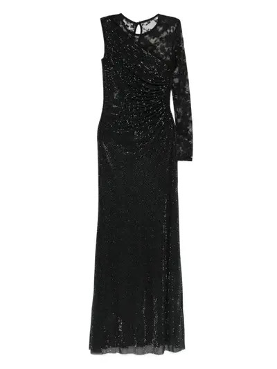 black embellishment detail one-shoulder neckline long sleeve lace panel
