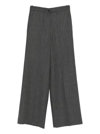 grey pinstripe pattern belt loops button and zip fastening back flap pockets wide leg