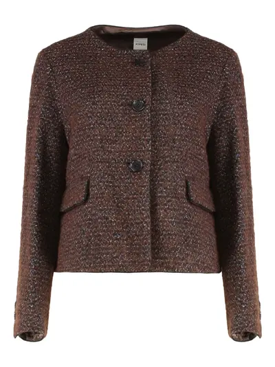 brown round neck front button fastening long sleeves two front flap pockets textured finish