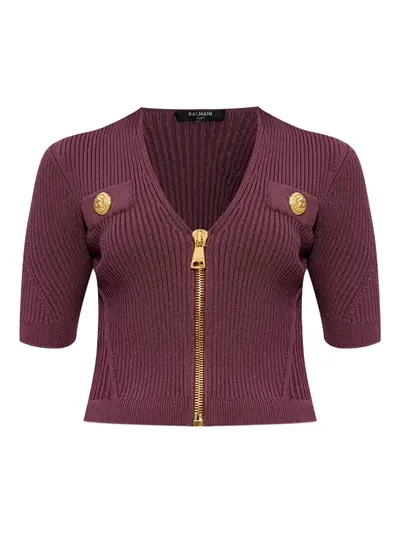 purple ribbed knit V-neck short sleeves front zip fastening gold-tone hardware
