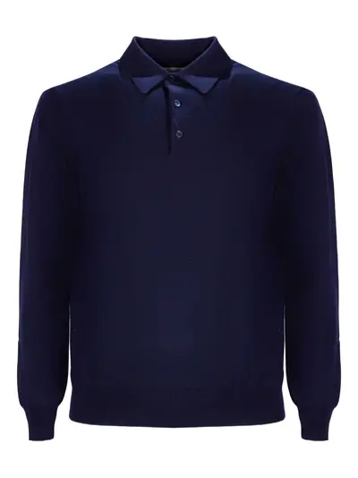 blue wool polo collar button fastening long sleeves ribbed hem ribbed cuffs