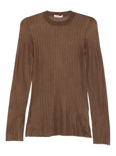 brown ribbed knit long sleeves round neck straight hem semi-sheer