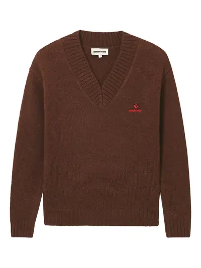 dark brown V-neck logo detail ribbed knit long sleeves ribbed hem and cuffs