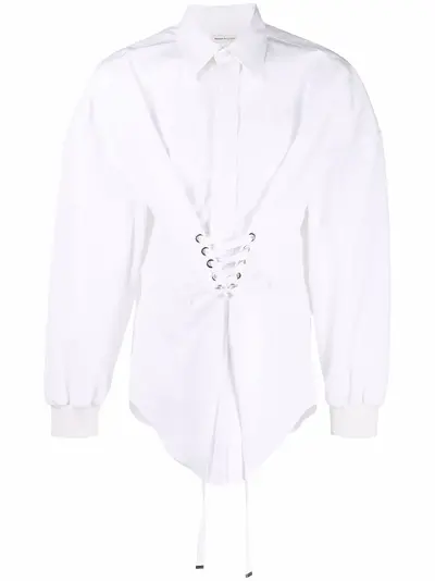 bright white cotton/silk-blend straight-point collar concealed front fastening front lace-up fastening drop shoulder long sleeves ribbed cuffs curved hem