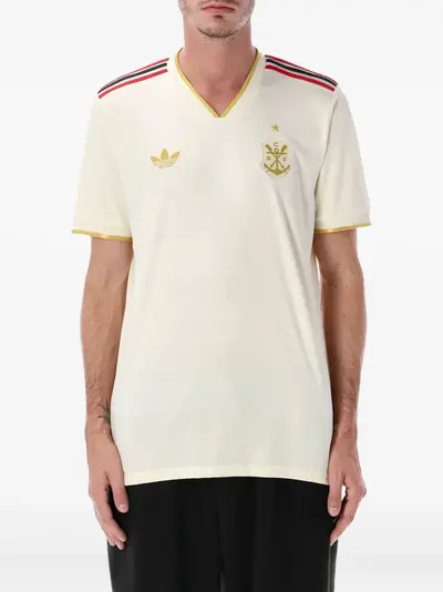 cream striped shoulders V-neck short sleeves logo detail emblem detail