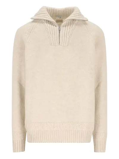 beige virgin wool front half fastening elbow patches long sleeves high neck ribbed cuffs and hem