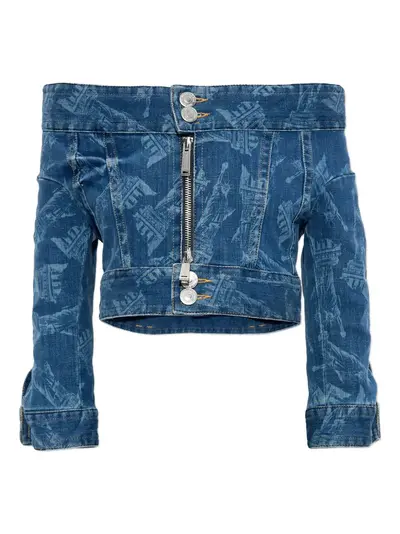 blue all-over print button fastening zip fastening three-quarter sleeves off-shoulder design