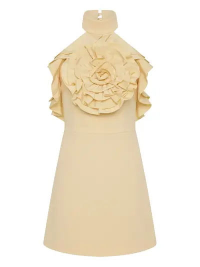 pale yellow floral detail halterneck sleeveless mini length back zip fastening
