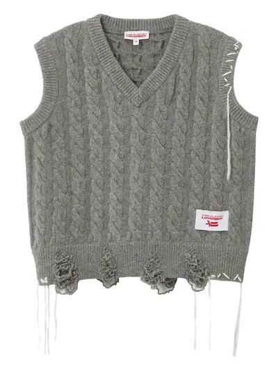 grey cable knit v-neck frayed hem sleeveless label appliqué