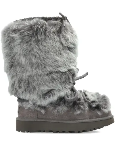 charcoal fur trim lace-up fastening ridged rubber sole round toe