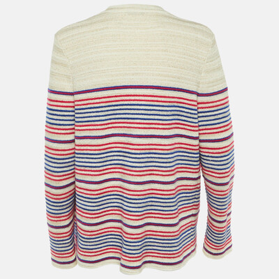 Indulge in luxury layering with this Chanel cardigan crafted from a blend of linen, cashmere, and shimmering lurex. The ivory striped design adds subtle glamour while maintaining timeless elegance. A chic addition to both casual and refined ensembles.