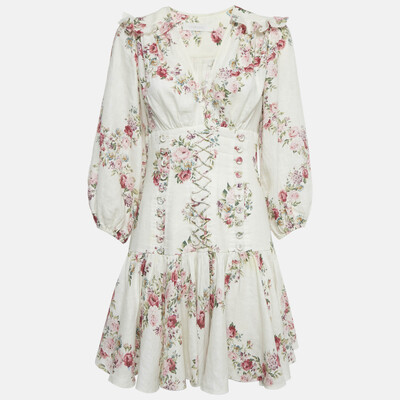 Zimmermann’s mini dress exudes romantic femininity with its rose print and lace up detailing. Crafted from breathable linen, it features puff sleeves and a defined waistline that accentuates the silhouette. Ideal for sun drenched days or resort evenings, it captures effortless bohemian elegance.