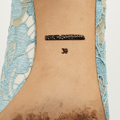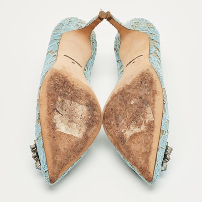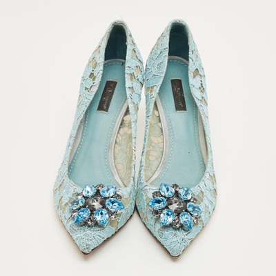 Deliver the most unforgettable looks in these grey pumps from Dolce and Gabbana From their shape and detailing to their overall appeal, they are utterly mesmerizing. The pumps are crafted from lace and decorated with crystals on their pointed toebox. They are complete with comfortable leather lined insoles and 7 cm heels.