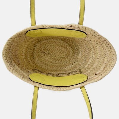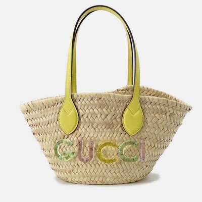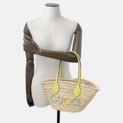 This authentic Gucci Logo Basket Bag in Yellow and Natural Straw with Leather accents is a pre loved designer piece that blends playful charm with refined craftsmanship. Crafted in woven straw with signature leather detailing and the iconic Gucci logo, it offers a versatile and casual chic silhouette. This pre owned Gucci basket bag is a stylish addition to any luxury collection, perfect for those seeking timeless design with a modern, summery appeal.