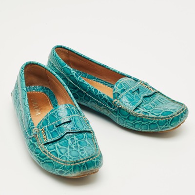 Step out in bold luxury with Prada Penny Loafers in teal crocodile leather. The rich texture and elegant design make them a standout addition to any wardrobe. Ideal for elevating both formal and smart casual ensembles.