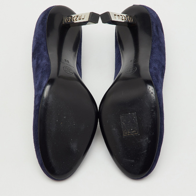 These Chanel pumps embody Parisian poise with their navy suede finish and discreet CC logo metal heels. The rounded toe and smooth interior reflect the maison’s commitment to comfort and elegance, making them an elevated choice for day to evening sophistication.