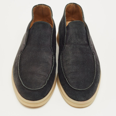 These Loro Piana boots feature soft navy blue suede with a sleek, ankle length silhouette. Designed for effortless elegance, they combine comfort with understated luxury. Perfect for pairing with tailored trousers or dresses for refined daywear.