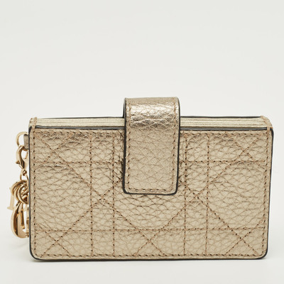 The Dior Lady Dior Card Case in gold Cannage leather combines a compact design with luxe detail. Its five gusseted slots open to organize cards and small essentials, while the charms add a familiar finish.