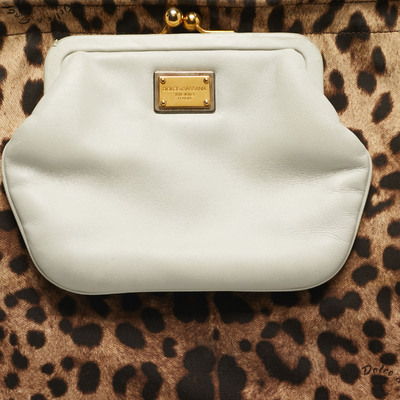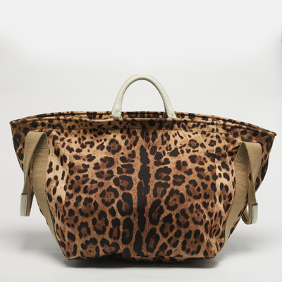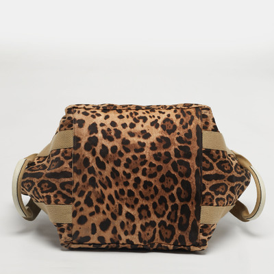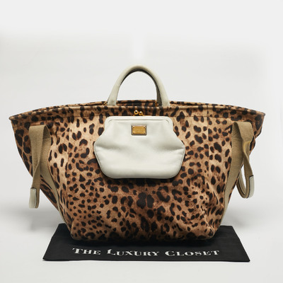 This Dolce and Gabbana tote combines brown and black leopard print fabric with smooth leather for a textured look. It features a tiny front pouch, sturdy handles, and a roomy interior that fits all you need.