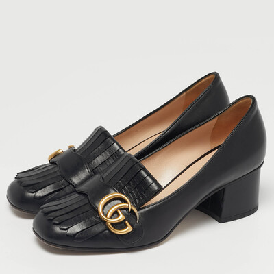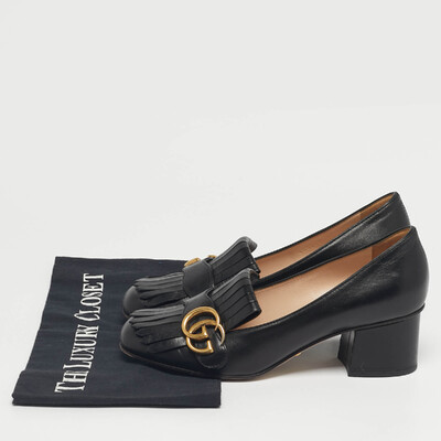 This pair of Marmont pumps by Gucci is a buy to wear and treasure. Theyve been crafted from quality leather in a black shade and styled with folded fringes with the brands signature GG in gold tone hardware on the uppers. Square toes and a set of block heels complete the pair.